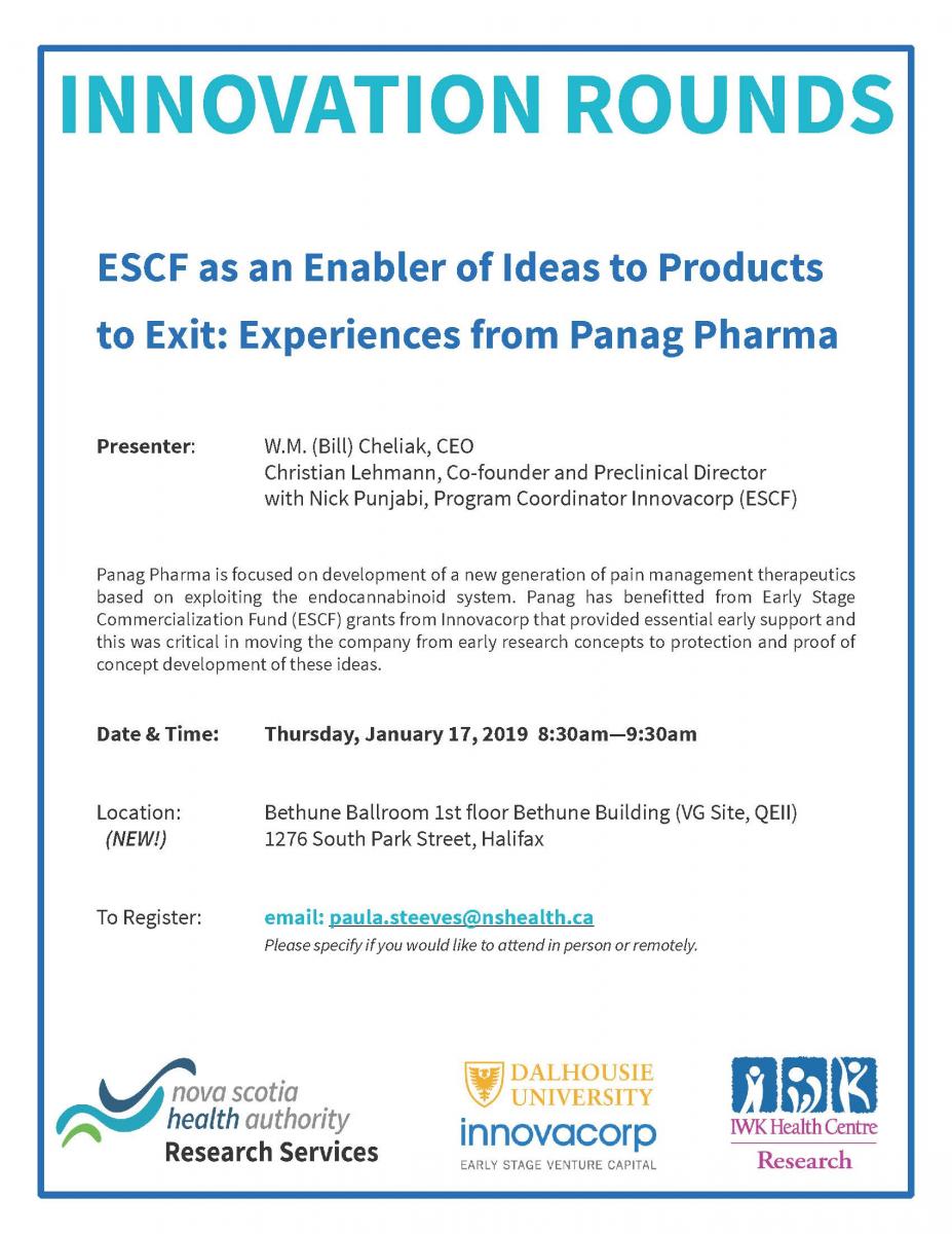 Innovacorp is pleased to be a partner of Innovation Rounds: ESCF as an Enabler of Ideas to Products to Exit - Experiences from Panag Pharma, happening from 8:30 am - 9:30 am in Halifax on January 17, 2019. See below for details and register for the gathering via email.